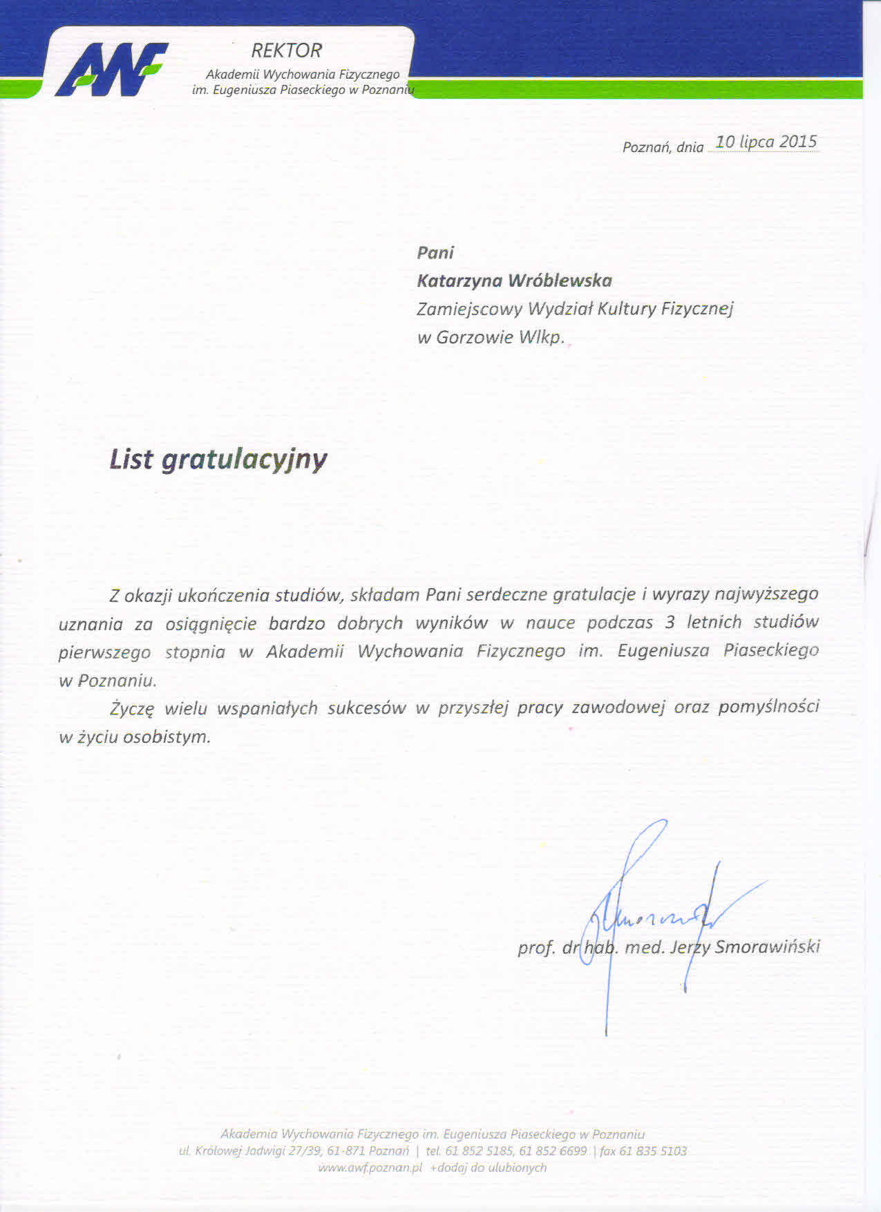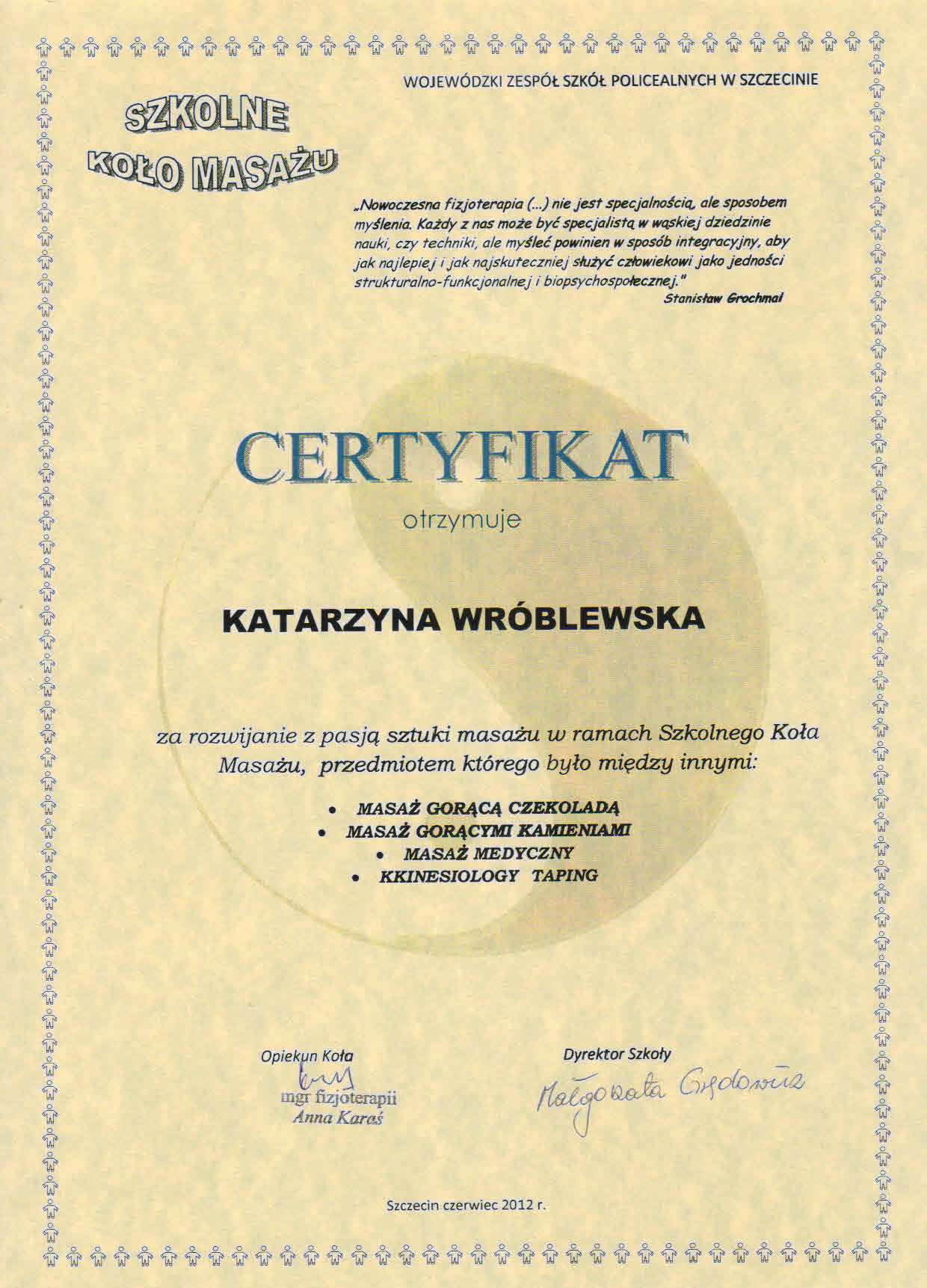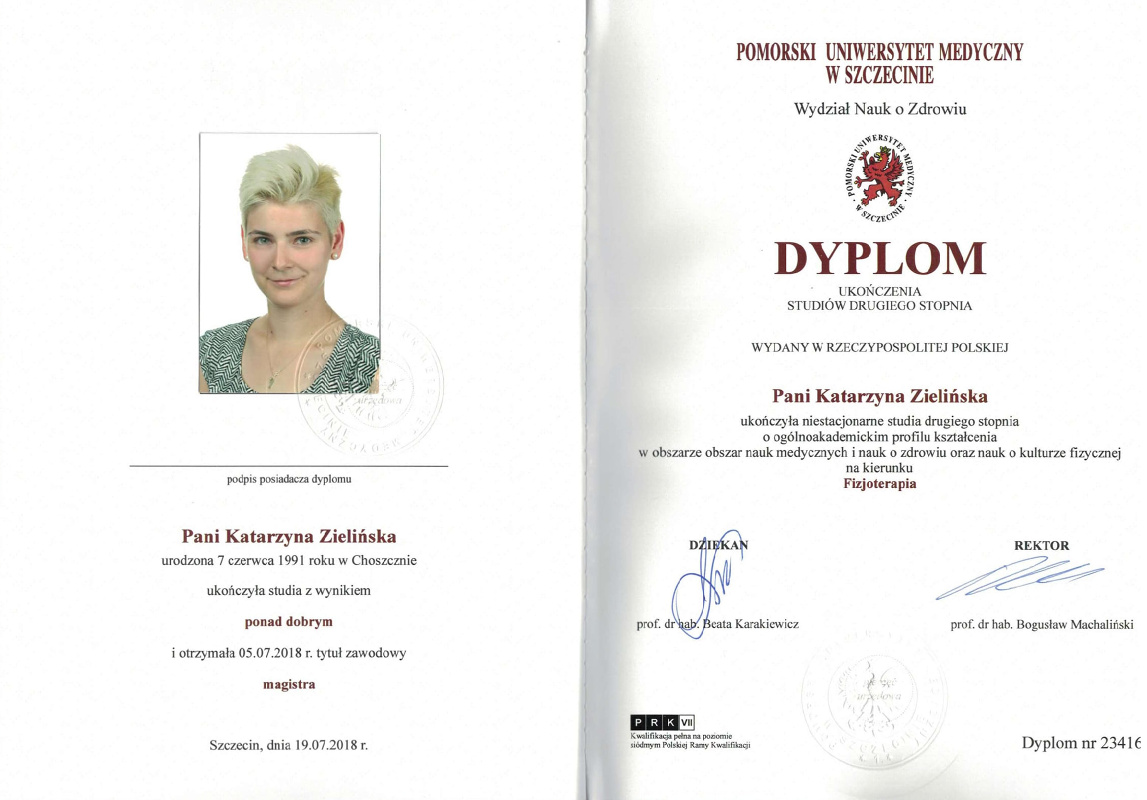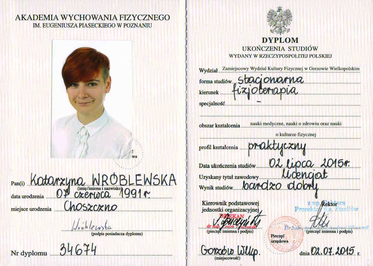 Ukończyłam Wojewódzki Zespół Szkół Policealnych w Szczecinie na kierunku technika masażu oraz Pomorski Uniwersytet Medyczny z tytułem magistra fizjoterapii.